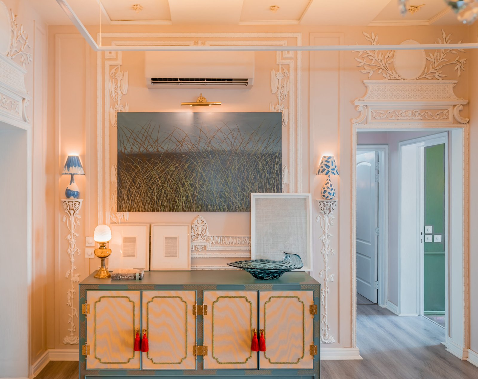 Soft tones, sculptural lighting, and curved forms define this serene corner. Textured walls, abstract art, and smooth finishes create a calm, modern composition with a touch of artistry.