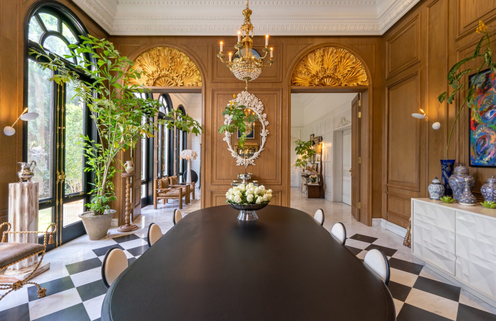 Classic wood-paneled walls, ornate moldings, and a checkered marble floor. Decorative arches with gilded detailing add a formal elegance, while mid-century inspired chairs and sculptural lighting introduce a contemporary edge. The space balances tradition and modernity, where craftsmanship and proportion take center stage.